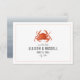 En rustik nautisk bröllopsinbjudan med en illustration av en röd krabba med grå text och urblekt röd randig design på framsidan. Baksidan har en akvarellinspirerad chambray-design.