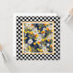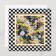 Vackra och konstnärliga bilder har tonvis med färgstark vit kamomill daisy och vallmoblommor i orange mot svart bakgrund med svart och vit schackbräda gräns