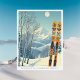 Bonjour från snöbergen i Chamonix, Frankrike, i Europa! Vi hoppas att du har en underbar skidsemester. Detta vykort har ett fantastiskt blått grått-bergslandskap med retro-skidbrädor i ett orange-stam mönster. Alla textfraser kan anpassas till kostym!