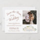 Det här vackra bröllop spara datum-kortet har en rustik boho-chic med ett kluster av handmålat ro, blommar och eukalyptus löv i nyanser av champagne eller mycket blek persika. På den lämnat sidan av kortet finns ett vackert skript med kalligrafi som lyder "spara datumet för bröllop i.." med utrymme för namn, plats och en kort-anteckning. På högerna finns det utrymme för fotot ovanför blommorna. Elegant, snyggt och chic, det här kortet är ett underbart sätt att låta dina vänner och familj veta att spara datumet för din speciella dag.