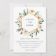 Elegant neutralt champagne vattenfärgblommor och grönt bladverk, adorberat på gyllene geometriska ram, bröllopsinbjudan. Bakåt av kortfunktioner som matchar blommigtens arrangemanga.