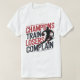 Den här vita t-tröjan har ord "CHAMPIONER" i ett fet rött teckensnitt överst, följt av "TÅG-ANVÄNDARE" även i rött men något mindre. Under visas "KLAGOIN" i ett större, djärvare rött teckensnitt. För högerna finns det en bild av en basketspelare som verkar vara Black, som borrar en boll. Utformningen är sportig och självsäker.
