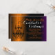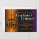 Cocktails och kostymer Invitation till vuxen Halloweenfest, Lyxig och modern ljuskrona med spindelnät som kryper. Klassisk och elegant men ändå spöklik Halloween-inbjudan till en skrämmande soaré eller en cocktails- och kostymfest. Svart och lila bakgrund med orange glöd och svart silhuett av en hängande ljuskrona med spindelnät på. Elegant skrivstil text kan anpassas med ditt speciella meddelande.