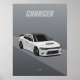 This artwork highlights wide-body proportions, sharp front-end design, and a powerful stance that define modern muscle sedans. The clean composition and restrained color palette keep the focus on form and presence, making it a strong visual statement without unnecessary distraction.