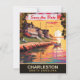Charleston spara datum bröllopsinbjudan, resa vykort. Hus på kusten och en tätningsbåt på vattnet. Solnedgång över landskapet.