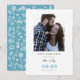 Denna charmanta spara-datum-kort innehåller ett förlovningsfoto och en illustration av Charleston-siluetten med Ravenel Bridge, tak och kyrktorn. En del av Charleston Toile Border i Blå bröllopsinbjudan-sviten. All text är redigerbar. Matchande artiklar finns tillgängliga.