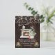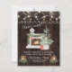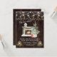 Unikt kortdesign med julgran, öppen spis, gamla lampor med ljus, vintergrönska, lampkedja på en gammal brädgård bakgrund. Använd verktyget Personifiera för att lägga till din information. Se även min Vi Har Flyttat-samling.