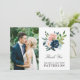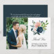Det här tackkortet i personligt bröllp innehåller en fotomall för överföring av ditt favoritfoto i bröllop. Detta kort är en del av en bröllop-svit som passar ihop med inbjudningar och andra bröllop-papper och -produkter. Det är en blandning av rosa och indigo blåa blommor med efterföljande grönenergi. Ett exempel på en anteckning finns på baksidan av det här platta eleganten som du kan redigera med ditt eget personliga meddelande. Byt ut exemplet bröllop med lodräts foto.