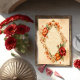Denna fantastiska spanska och medelhavsinspirerade inbjudan har färgglada, eleganta, klassiska, sofistikerade och djärva färger och lätta invecklade naturliga ramdetaljer som är kantade med rosor i dämpade men ljusa röda och orangea nyanser. Den mjuka patinan på papyrus-papperets bakgrundsfärg förstärker den rustika och naturliga känslan.
