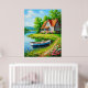 Idyllisk lantlig scen med ett rustikt hus vid en sjö, en liten träbåt på vattnet och frodiga trädgårdar fyllda med färgglada blommor under en klar blå himmel.