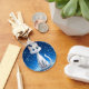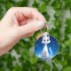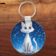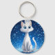 En förtjusande illustration av en vit katt med uttrycksfulla blå ögon, mot en strålande bakgrund av skimrande blå ljus, som frammanar en magisk och fantasifull stämning.