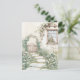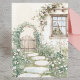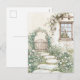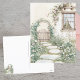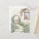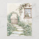 Vårsommar-kort med en charmig stugträdgård i en mjuk akvarellstil. En slingrande stig av sten leder genom frodig grönska och ömtåliga vilda blommor i rosa, vitt och mjuka pasteller. En välvd trädgårdsport prydd med klängväxter tillför en fantasifull touch till scenen. Den rustika stugväggen är delvis synlig med en fönsterbåge i trä och forsande gardiner. Ovanför fönstret bär ett spaljéverk fallande rosa blommor och förstärker den romantiska och lugna atmosfären. Illustrationen inger en känsla av stillhet, nostalgi och lantlig charm.