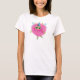 This white, short-sleeved t-shirt features an adorable, fluffy, pink monster who is ready to party. The character is wearing a pointed, blue party hat, has small fairy wings and green limbs, and is standing in striped socks/shoes. The design is cheerful and child-friendly, making it an ideal gift for a birthday or any party.