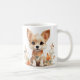 Enjoy your favorite beverage with this adorable mug featuring a fluffy Chihuahua adorned with a beaded necklace and heart-shaped pendant. Surrounded by delicate orange and beige floral elements, this design captures the playful and loving nature of Chihuahuas. Perfect for dog lovers, this mug adds a touch of charm to your morning coffee or afternoon tea.