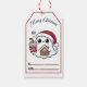 En underbar julklapp visar en glad märkre med en julhatt. Den har en kopp av hett kakao och ett gingerbröd, perfekt för helgdag.