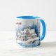 Den här charmerande designen har en söt renare i en blå grått-halsduk framför ett vintrynkland, med dekorerat snöstrå Julgranar, ett mysigt festhus och en damm. Din eller mottagarens namn visas i en röd maron-mörk) mitten i kopp (mittemot handtaget mot på vardera sidan).Se till att skriva namnen som du vill ha i avsnittet Anpassa. Den här designen visas på en kombination av mugg och himlar blå - nästan en turkos - handtag och kopp inuti, men det finns många andra alternativ, både enkla och finare.
