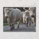 Ett vykort med en besättning av Charolais-boskap som går längs vägen nära och tittar på kameran.