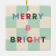 Created to coordinate with the "Checkerboard Merry & Bright" holiday card collection, this whimsical Christmas ornament features the phrase "Merry & Bright" in bold, colorful lettering, placed over a modern, mint checkerboard pattern. The back of the ornament has space for a customer photo.