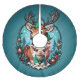 Cheerful and inviting Christmas illustration with a cartoon deer and a lamb, surrounded by a harmonious blue-green background that creates a wintery atmosphere. The deer stands protectively behind the lamb, who is dressed in a cozy green sweater and has a bright red Santa hat on his head. Both radiate joy and friendship, their big, expressive eyes sparkling with enthusiasm. The lamb looks out into the world curiously and happily, while the deer reinforces his presence with a gentle smile and draws the viewer into the festive spirit.