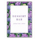 This elegant wedding tabletop sign features a lush floral border with hydrangea flowers in shades of purple and blue, creating a vibrant frame around the central white space. The design includes a mix of serif and sans-serif typography that reads "DESSERT BAR" and "PLEASE TAKE A TREAT!" inviting guests to indulge in sweet treats. The cheerful and sophisticated style makes it perfect for adding a touch of celebration to any event or gathering.