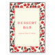 This wedding tabletop sign features a charming design with a central cream border surrounded by a playful pattern of red cherries and dark green leaves on a white background. The bold serif typography in deep red announces "DESSERT BAR" with an inviting message below, encouraging guests to indulge. The classic and cheerful aesthetic creates a welcoming atmosphere perfect for celebrations, making it an ideal addition to any dessert station setup.