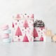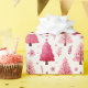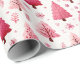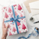 A whimsical watercolor pattern featuring pink and red Christmas trees scattered across an off-white background. Snowflakes and stars dance between the trees, adding a magical, festive charm to this soft and playful holiday design.