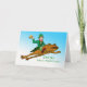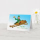 Skål! St. Paddy's Day. Patrick's Day-hälsningskort med en leprechaun som håller en öl och rider på en groda. Grodan flyger genom ljuset blå himmel. Leprechaun är klädd i en grönt kostym, strimlade strumpor och har en grönt hatt. Art, bild och versell copyright © Shoaff Ballanger Studios, 2024.