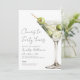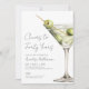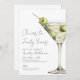 On the right, a watercolor classic martini garnished with green olives brings in that timeless cocktail vibe. The vertical layout keeps everything clean and simple, with the party details arranged in a neat mix of serif and script fonts.