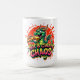 En lekfull drake med horn slukar ett ostfärdigt pizzabagel, som förkroppsligar kaoset från en roligt och utsökt pizza party.