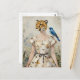 A surreal cheetah woman in a dress made from birch bark with a bluebird on her shoulder fashion collage