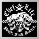 Den här kulinariska konsten har en digital kock med tre coolors kock döskallar som bär skal framför en solid svart bakgrund. En klassisk kulinariskt kontrollerad rand springa bakom de tre köksmästarna. Flaming över kocken knivar ligger över döskallarna, medan texten från Gamla engelska stil beskriver tre viktiga inslag för dem som verkligen lever av Chef Life. Bakad, Fried och Sauced.