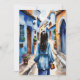 Brevkortet har en vattenfärg porträtt på en kvinna som går längs en gränd i Chefchaouen, Marocko.