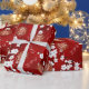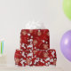 Denna pappra förpackning har en svart och vit körsbärssymbol i blommarna gren, lyckosymboler för dubblan i guld samt brud och groom i initialer på en strålande röd bakgrund.