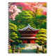 Ett fredligt japanskt tempel omgivet av körsbärsverk och grönt träd art.