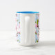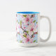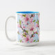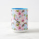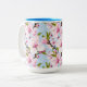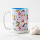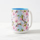A two‑tone mug featuring delicate cherry blossom branches in soft pinks and greens set against a serene blue background, adding an elegant, calming touch to daily coffee or tea rituals. A refined, gift‑ready choice for nature lovers and fans of graceful floral design.