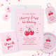 "Cherry first birthday" themed birthday napkins with illustrated cherries tied with a pink preppy bow, and adorable handwritten fonts.