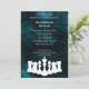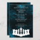 Den här chess-födelsedagsinbjudan har en blå nebulabönsdesign med vit schack delar som omfattar kung, biskopar, knivar och rockar.