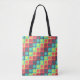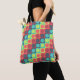 Den här bilden har ett sömlöst, geometriskt mönster med ett dynamiskt polka dots centrerat inuti färgadens kvadrater, vilket skapar en nivåindelad effekt. I paletten färg finns skuggor av gult, orange, rött, grönt och djup lila, ge det till en reflexfylld vibe. Konstruktionen är symmetrisk och visuellt rytmisk, vilket påminner om moderna textilavtryck i mitten av århundradet.
