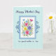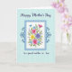 Det här kortet har en hög layout med en ljus bukett centrerad inuti en vit rektangulär panel, som en fräsch gåva som ges med tillgivenhet ❤️. Blommorna blandar fuchsia, mjuk rosa, solig gul, lugn blå och milda lila kronblad, inklämda bland bladgrönt och små stjärnliknande accenter som känns som en söt delad stund. En dubbel kantlinje i medelblått och ljust blått omsluter panelen och ger buketten en mysig, omfamnad look. Dekorativa mörkblå virvlar sitter till vänster och höger och tillför en gammaldags touch utan att kännas tunga. Nära den övre kanten av ramen vilar en liten djupblå fågel som om den stannar upp för att se över scenen 🌼. Bakgrunden är blek akvamarin med en svag ruttextur som håller allt luftigt och ljust. Mörk indigofär