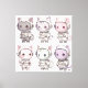 Nio super söta chibi-kattungar utklädda som små astronauter strålar med stora gnistrande ögon och unika uttryck - från stora, undrande ögon och glada leenden till busiga ögonblinkningar och tårfyllda smollmunar. Fluffiga öron sticker ut genom hjälmarna, färgglada pälsmönster lyser (creme tabby, lavendelspets, grått som månfaserna, pastellavendel, osv.), och varje rymddräkt gnistrar med genomskinliga visir, uppdragslappar, bröstemblem, handskar, stövlar och söta, krulliga svansar. Arrangerade i ett rent 3×3-rutnät mot vit bakgrund sprutar samlingen kawaii-charm, sci-fi-gullighet, fantasifull rymdäventyrs