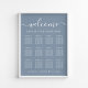 Chicens nedladdningsbara, dammiga, blå bröllop-sittplatskarta poster upp till 12 bord med ett "välkomstskript" i ett snyggt vitt skript med dekorationer, "Hitta ditt säte" i elegantens vita typografi och namn och bröllop gått med tillsammans av ett hjärta. Med alternativet för digital nedladdning kan du redigera med ändringar i sista minuten och skriva ut lokalt.