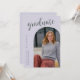 The graduation invitation has a modern and elegant design. The front features a large script title, an arch-shaped frame showcasing the graduate’s portrait, and vertical text displaying their name and school in a clean serif font and Pale lavender Background. The back maintains a minimalist style with a bold script heading, structured event details, and a small graduation cap graphic. The design is clean, sophisticated, and easy to read.