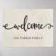 Det här rustiska och trendig lantgårdshuset poster en fin vit träbakgrund, med ord "välkommen" i ett snabbt typsnitt. Anpassa till din familj namn.