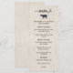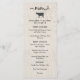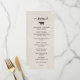 Det här trendiget och bröllop-menyn har en modern vibe med sin elegant svart text, komsilhuett och manustypografi på en vit träbakgrund.