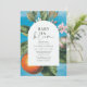 Welcome your little one with our Baby in Bloom baby shower invitation, a graceful balance of vintage charm and modern refinement. A luminous blue watercolor background highlights a vibrant orange still resting on its delicate branch, framed by soft white blossoms for a striking, artful contrast. A crisp white arched frame overlays the scene, slightly smaller to let the citrus and florals subtly emerge, adding depth and quiet sophistication. Inside the arch, your personalized details unfold in an elegant mix of vintage-inspired lettering and contemporary script, giving “Baby in Bloom” a refined yet fresh presence. The result is a timeless, Mediterranean-inspired invitation that feels artistic, polished, and effortlessly chic.