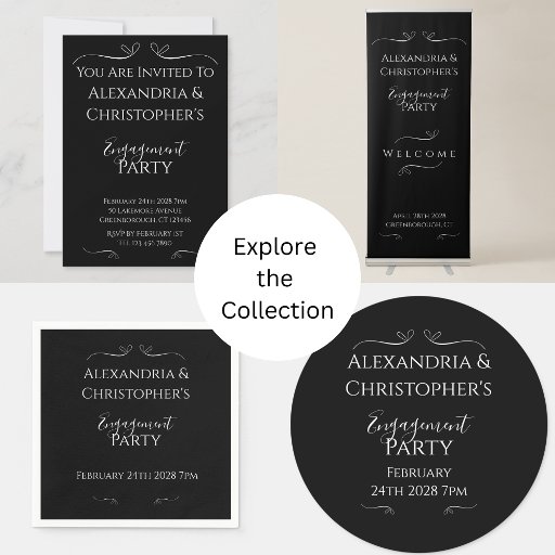 Add a sophisticated touch to your event with this chic black and white script engagement party design. Perfect for a modern or formal celebration, this minimalist look suits any couple. Contact the designer for help with personalization and customization.