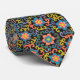 Seamless black textile pattern featuring stylized orange and blue flowers interspersed with neon green and blue swirling vine motifs.