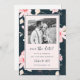 Ett vackert kort för rosa blommigt bröllop spara datum har ett botaniskt mönster av ömtåliga rosa blommor med mörk blått bakgrund. Söt sparar datumkalligrafiskriptet och ett fullt fyller i det här moderna spara datum meddelande.