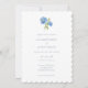 Det här vackra blommigtens platta vigselkort visar en ny, elegant och ungdomlig ton. Kortets framsida innehåller inbjudningstext i en contemporary av typsnitt i dammigt blått typsnitt och en vacker blommigt vattenrameillustration. På baksidan finns ytterligare text som du kan använda som vägledning för gäster på webbplatsen bröllop. Anpassa den här bröllopsinbjudan till elegant och snyggt för att göra den till din egen.
