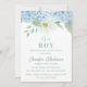 En elegant babyduschinbjudan med blåa vattenområden, perfekt för en vår- eller sommardusch. Den klassiska blommigten har mjuka, blå vattenfärgsvattenramper som accentueras med grönt blommor och löv.